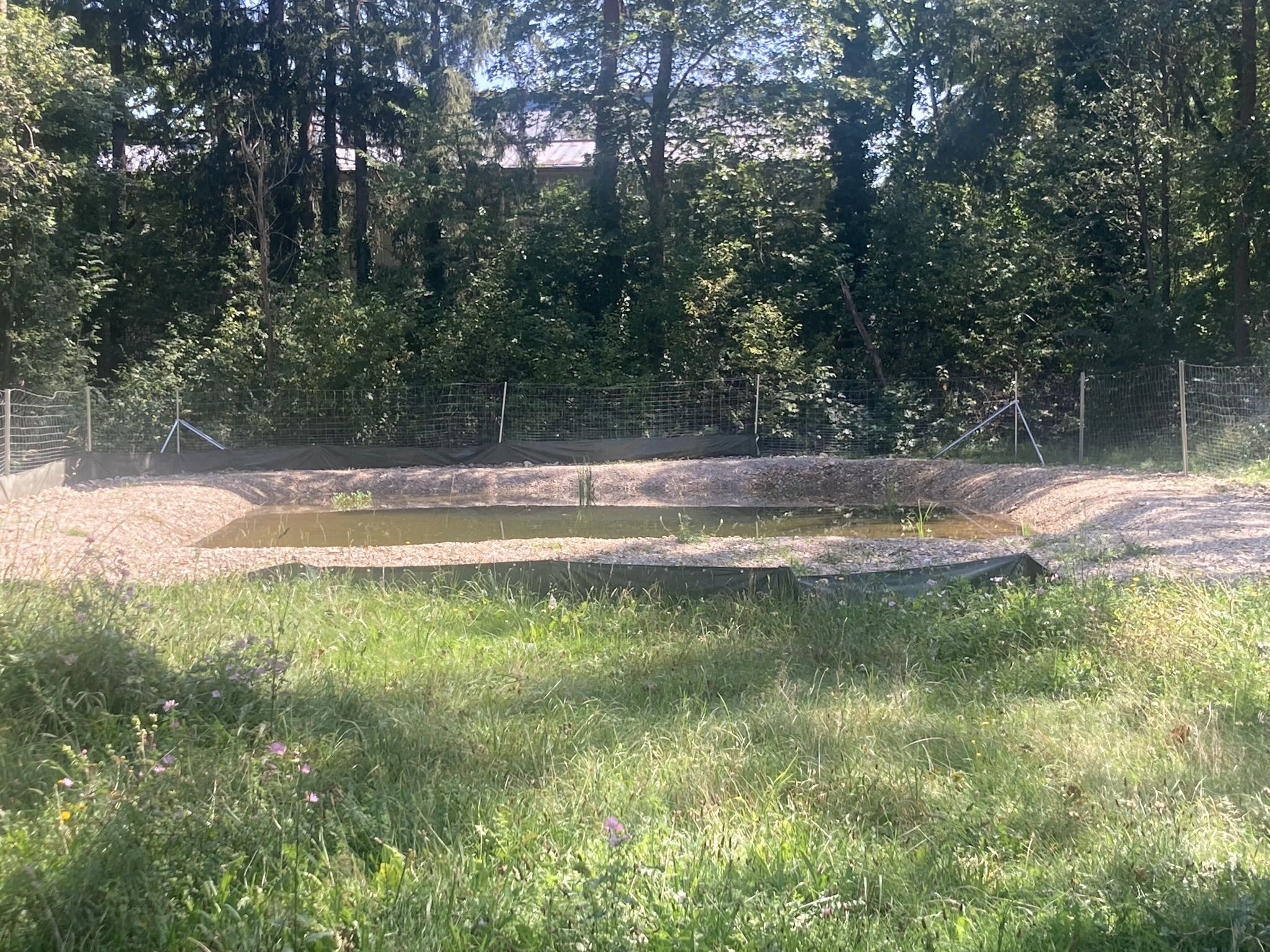 Die Arbeiten begannen Mitte April 2024 mit dem Einbau eines Tores in den vorhandenen Zaun. Die Firma Königsberger Landschafts- und Gartenabau machte den Aushub,die Modellierung des Teichrandes und Einbau der Teichfolie. Den Wildschutzzaun zur Abtrennung ds Teichareals vom Grunstück der SWM machte der Arbeitskreis Artenschutz mit Unterstützung der Ortsgruppe und Anwohnern aus Trudering. Mit dem Einsezten von Wasserpflanzen waren die Bauarbeiten Anfang Juni 2024 abgeschlossen.