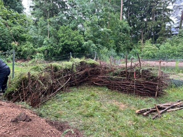 Im weiteren Verlauf des Jahres wurden in der Umgebung des Teichs Biotope für weitere Arten anlgegt: eine Benjeshecke, ein Steinhaufen für Liebhaber trockener und warmer Standorte und ein Hügel mit Lehmkante für Wildbienen.